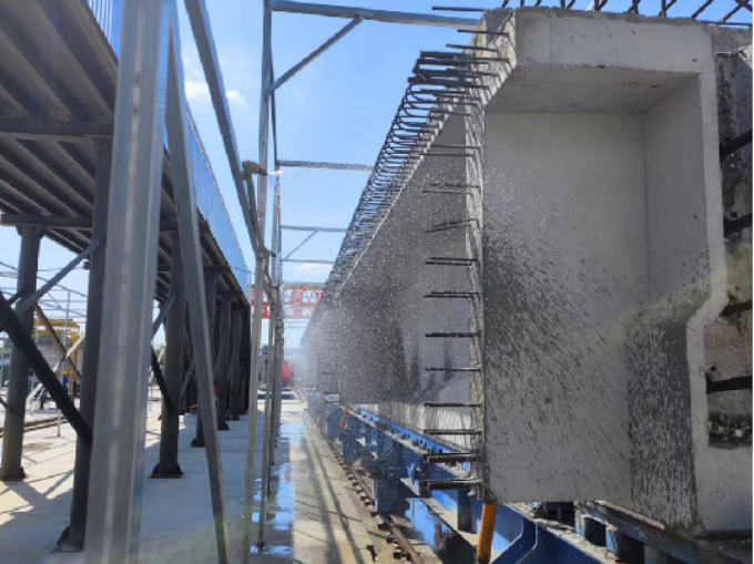 自動噴淋系統(tǒng)噴嘴在水流沖擊下360°不斷旋轉(zhuǎn),將養(yǎng)護(hù)水噴到待養(yǎng)護(hù)梁的每個角落